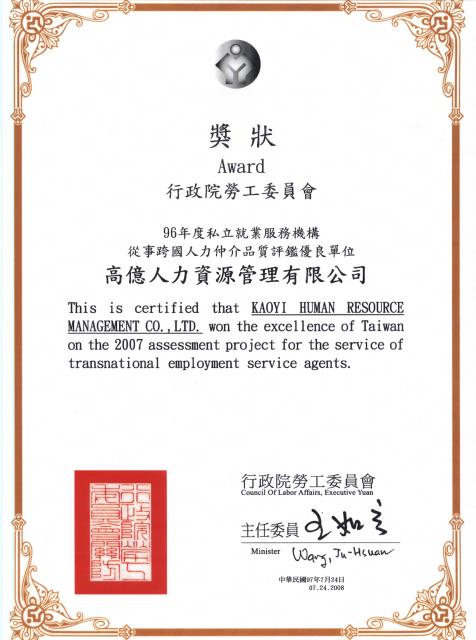 榮獲 勞委會表揚頒獎典禮 Reward
